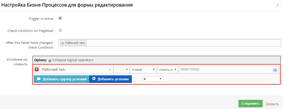В «Открыть Редактор» заполняете необходимые условия, которые будут проверяться каждый раз при изменении заданного поля. Здесь мы задали условие «Рабочий тел. = 79161737532», проверять условие после каждого изменения поля «Рабочий тел.».