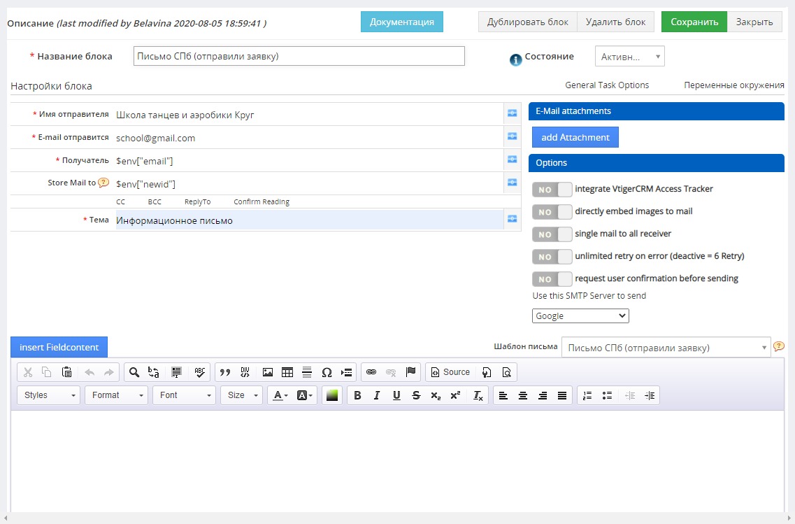 Поделиться ... Google+ Twitter LinkedIn Facebook Pinterest Содержание Отправить eMail Настройки Задачи Дополнительные настройки Шаблон письма Статистика Обсуждение Отправить eMail Вы можете отправлять письма как одному, так и множеству получателей используя основной адрес электронной почты, либо выбрав другую учетную запись SMTP Вы можете прикрепить один или несколько документов со следующих ресурсов: Из модулей:https://it-solutions4you.com/extensions/vtiger/pdf-maker/ и SQLReports Связанный с данной Записью документ Любой файл по URL. В URL можно подставлять значения полей Задача «Отправить Письмо» Настройки Задачи Значения и настройка полей Имя Отправителя — название компании отправителя без дополнительных знаков типа скобочек, запятых и т.д., например, как на скриншоте Email Отправится — адрес электронной почты, с которой будет отправлено письмо (должен совпадать с настройками выбранного SMTP-сервера Получатель — в это поле можно вписать статичный адрес электронной почты (например user@yandex.ru), переменную (например, переменная для поля email — переменную можно выбрать из списка переменных для полей, если нажать на голубой значок в конце поля справа) из Записи или пользовательскую переменную, которая была определена заранее (как это указано в скриншоте) Store mail to — указание с какой записью будет связано отправленное письмо: можно вписать статичный ID, можно вписать пользовательскую переменную, в которой хранится ID свежесозданной записи (такой пример указан на скриншоте) CC — Копия письма (дает возможность добавить еще несколько получателей вашего письма BCC Скрытая копия. Получатели не будут видеть адреса, указанные в этом поле ReplyTo Адрес, который будет автоматически подставлен в письмо, когда получатель нажмет Ответить в своей почтовой программе. Confirm Reading Уведомление о прочтении. Тема — обязательное поле Дополнительные настройки Integrate VtigerCRM Access Tracker — Вставляет трекер, который позволяет проверить, сколько раз письмо было прочитано, но увеличивает шанс попасть в «Спам» directly embed images to mail — Картинки из письма будут вставлены как вложения. Они будут показаны, даже если у получателя стоит опция не показывать картинки с внешних сайтов. single mail to all receiver — ulimited retry on error (deactive = 6 Retry) — В случае ошибки, попытаться отправить письмо еще 6 раз, в случае неуспеха — прекратить попытки отправить письмо request user confirmation before sending — Запрос у пользователя подтверждения отправки письма Use this SMTP Server to send — выбрать SMTP запись, которая будет использоваться при отправке письма Шаблон письма — письмо можно оформить либо непосредственно в задаче, либо можно выбрать шаблон письма, который будет отправлен получателям Шаблон письма Шаблоны из модуля Шаблоны E-mail В vTiger CRM есть стандартный модуль Шаблонов Email. Вы можете выбрать один из ваших шаблонов в списке Шаблон письма. При генерации письма будет вызван стандартный обработчик шаблонов, который заменит имеющиеся в них переменные на значения соответствующих полей. Стоит учитывать, что для модулей, где не предусмотрена отправка E-mail, некоторые переменные могут не работать (например имя Контакта при отправке письма из бизнес-процесса, вызываемого для Заказа). Это можно исправить используя переменные в формате Дизайнера Бизнес-Процессов. Шаблоны Дизайнера Бизнес-Процессов В Дизайнере Бизнес-процессов нет отдельного хранилища шаблонов Email, для каждой задачи используется 